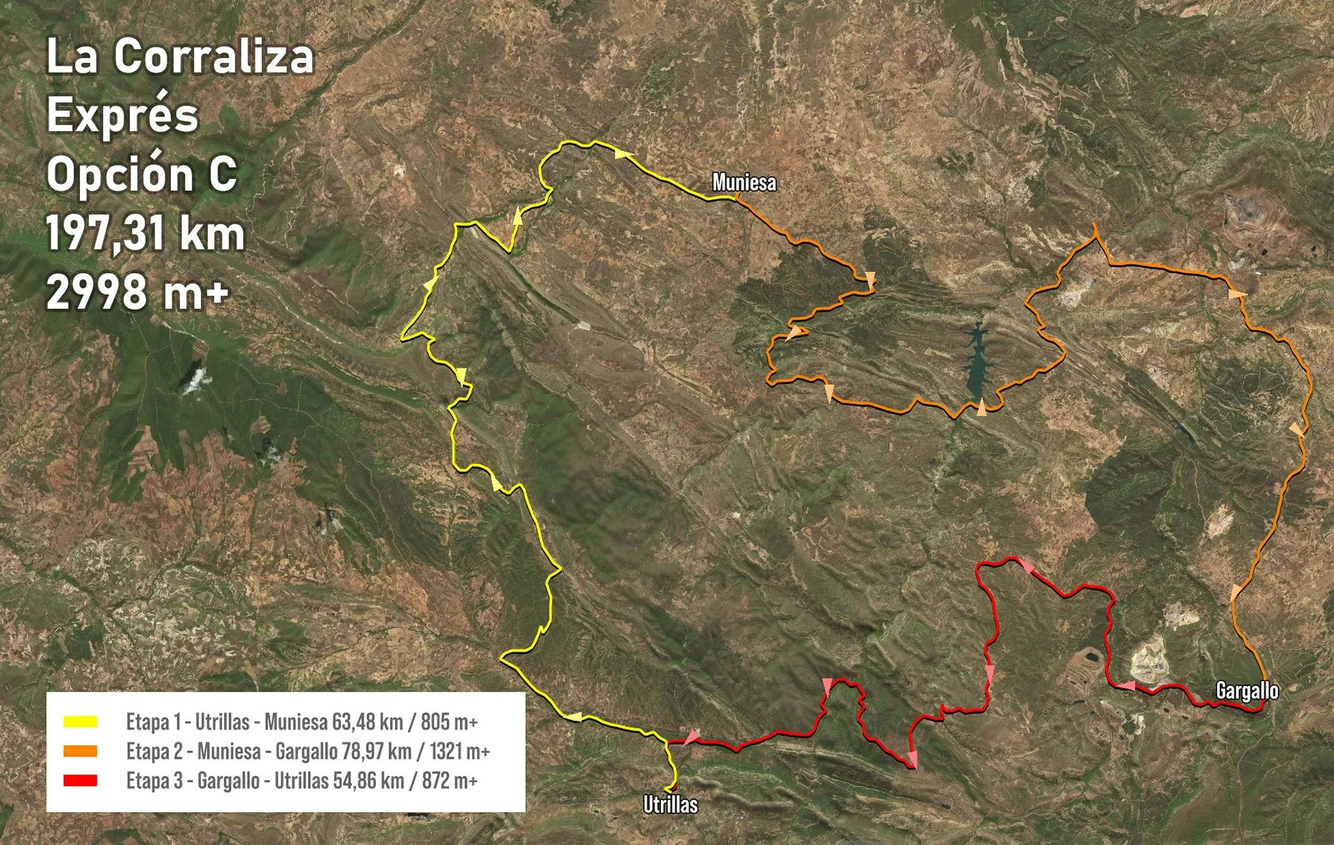 La primera etapa es idéntica a la opción A pero en la segunda se propone toda una “etapa reina” que acaba con el circuito Raspador - Montoro de Mezquita - Puerto de San Cristobal (por pista) - Boca del Infierno y llegada final a Aliaga. Esta etapa se puede recortar en 30,6 km y 858 m+ eliminando el bucle del Raspador y la bajada a Aliaga por la Boca del Infierno (pero manteniendo la visita al mirador de los Órganos de Montoro y el puente del Vado). La última etapa supera la sierra de Sant Just por la vertiente sur para llegar de vuelta a Utrillas.